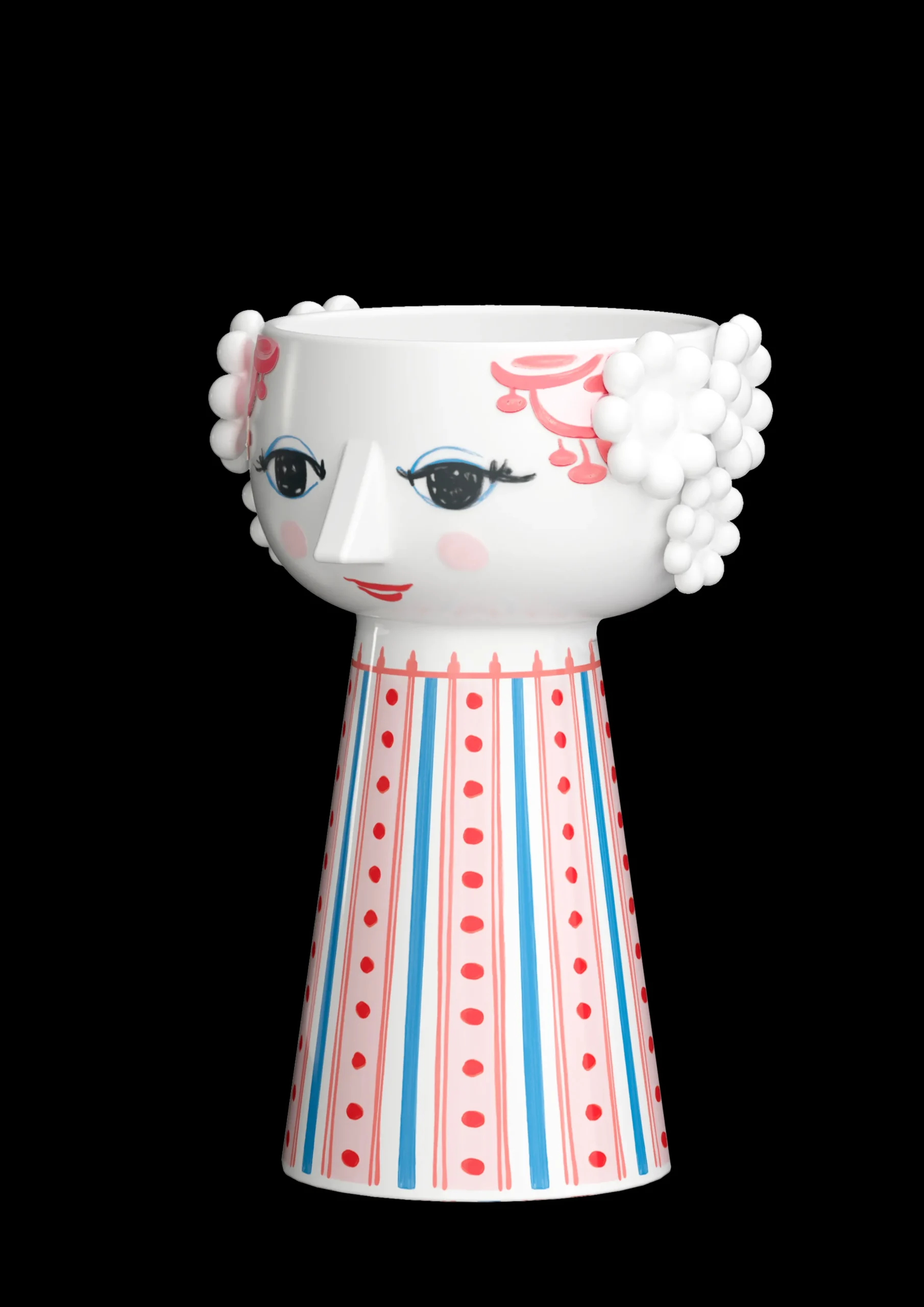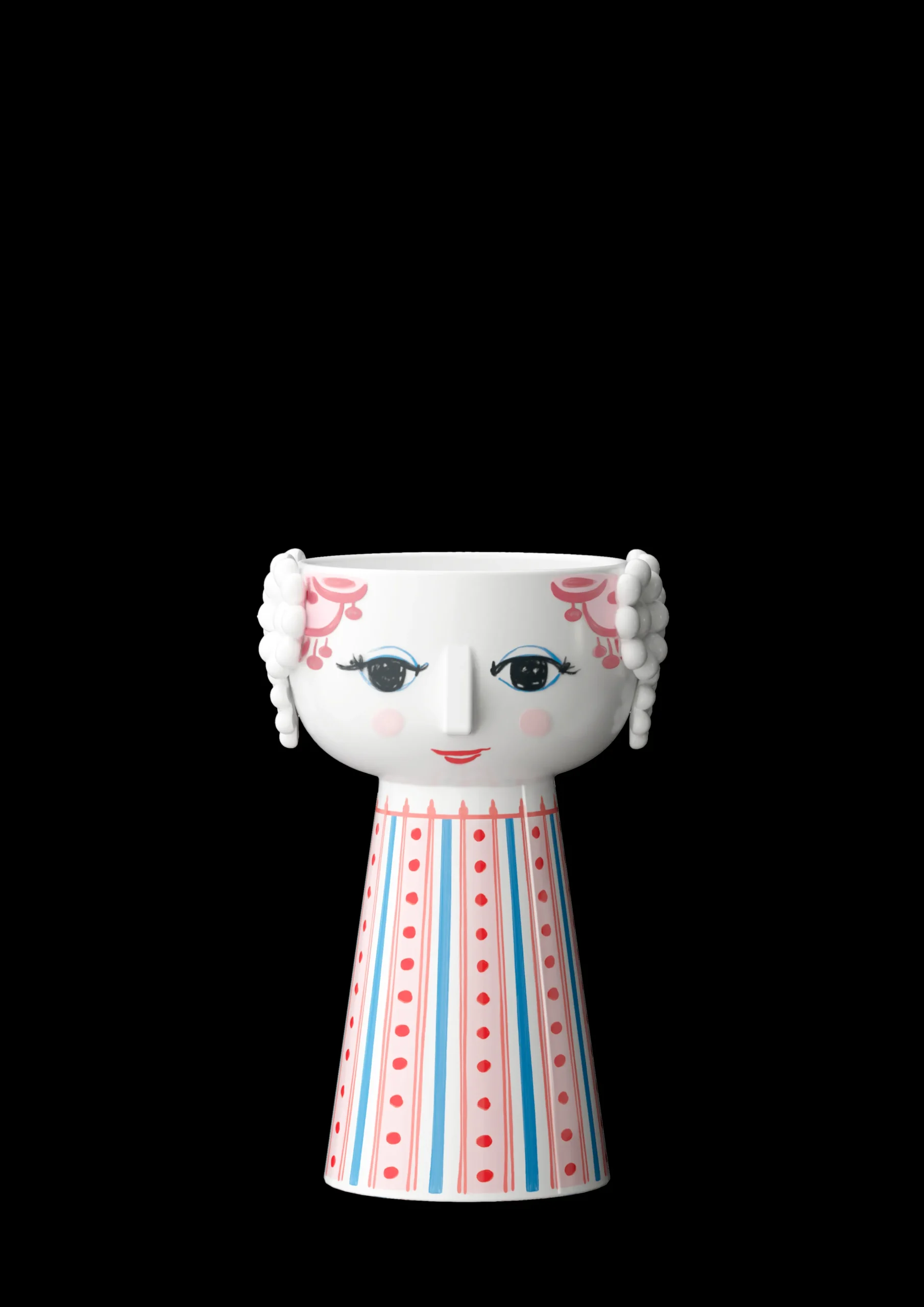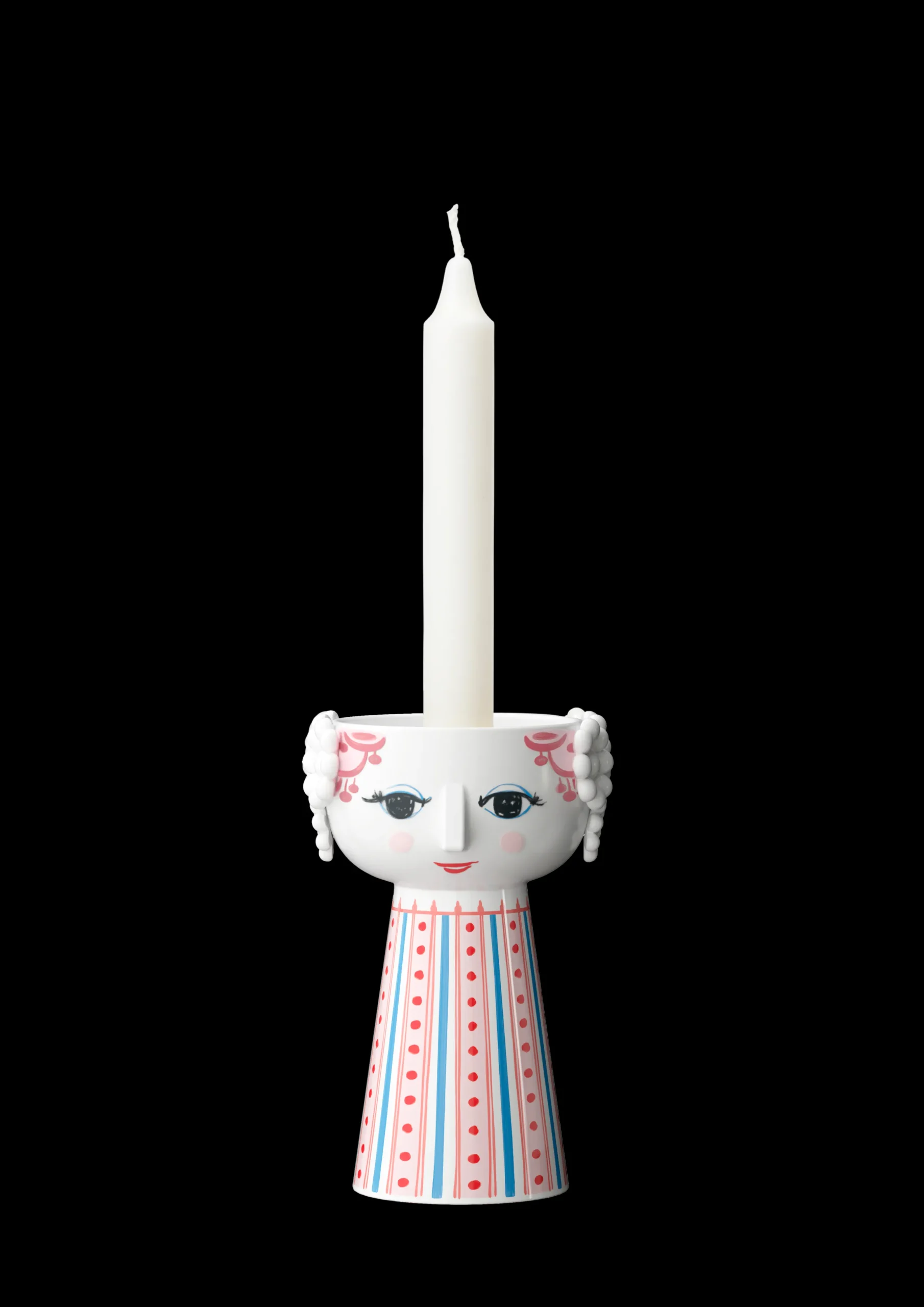 Utfold din fargerike personlighet og la kreativiteten skinne med Bjørn Wiinblads Eva. Med sitt glade smil, blussende kinn og fargerike dekorasjoner rommer Eva på alle måter essensen av Bjørn Wiinblad som person og kunstner – også når hun tar form som lysestake. Glad og drømmende skaper hun liv og personlighet i innredningen med sitt poetiske uttrykk og sine sprudlende farger. Denne Eva-lysestaken er 14 cm høy og er holdt i fargen dus rød med detaljer i rosa, røde og blå nyanser. Når et tent lys plasseres i lysestaken, lyser den enda mer opp og gjør hverdagen litt mer fargerik. Lysestaken er laget av blankglasert keramikk med farget dekal og er inspirert av Bjørn Wiinblads originale Eva-univers, der brede hoder med blomsterdekorasjoner og en kjegleformet kropp dannet fundamentet. Ansiktet med de mandelformede øynene og den spisse nesen er Wiinblads opprinnelige strek, og det fargerike kjolemønsteret er en nytolkning av Bjørn Wiinblads illustrasjoner fra arkivene.