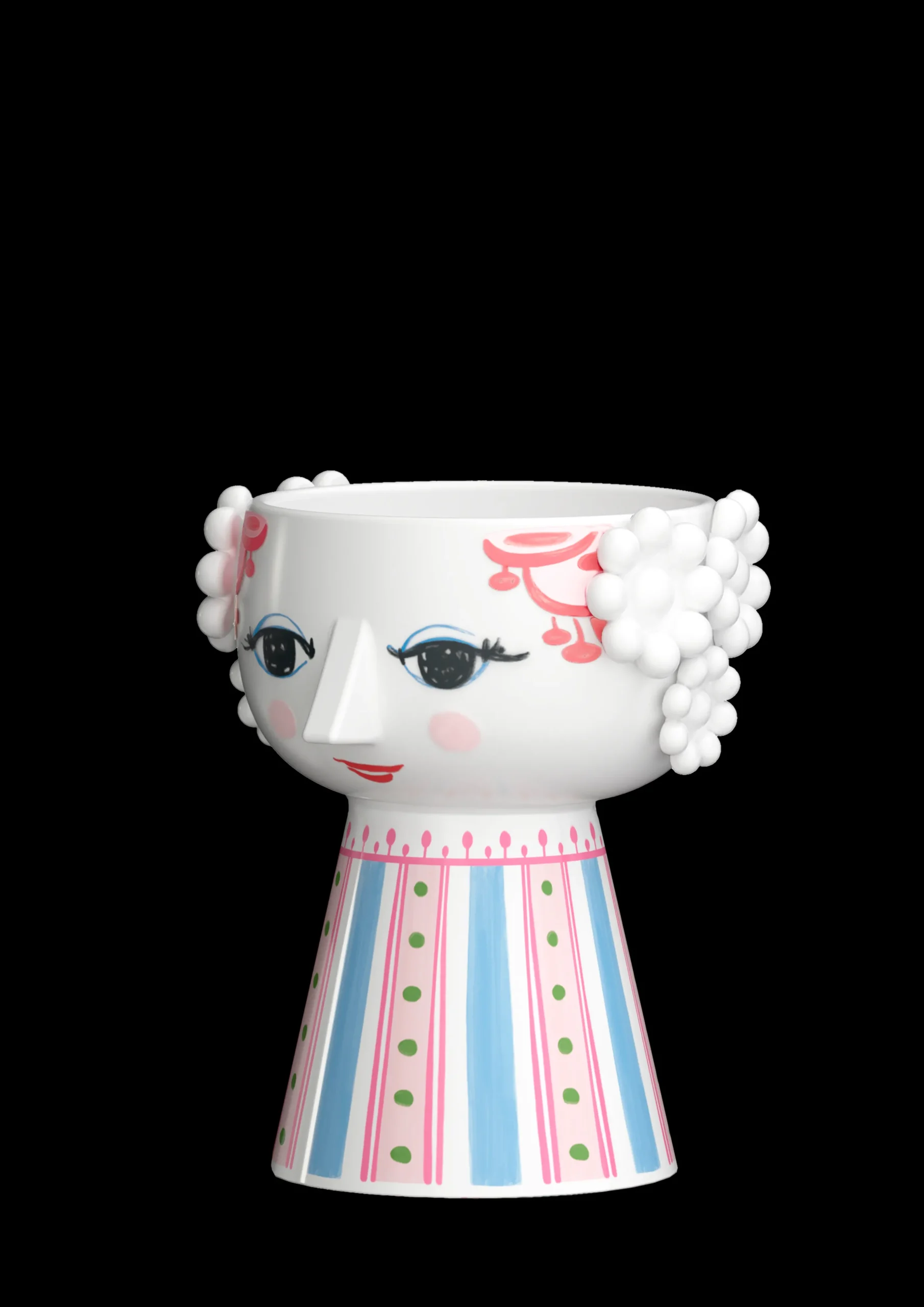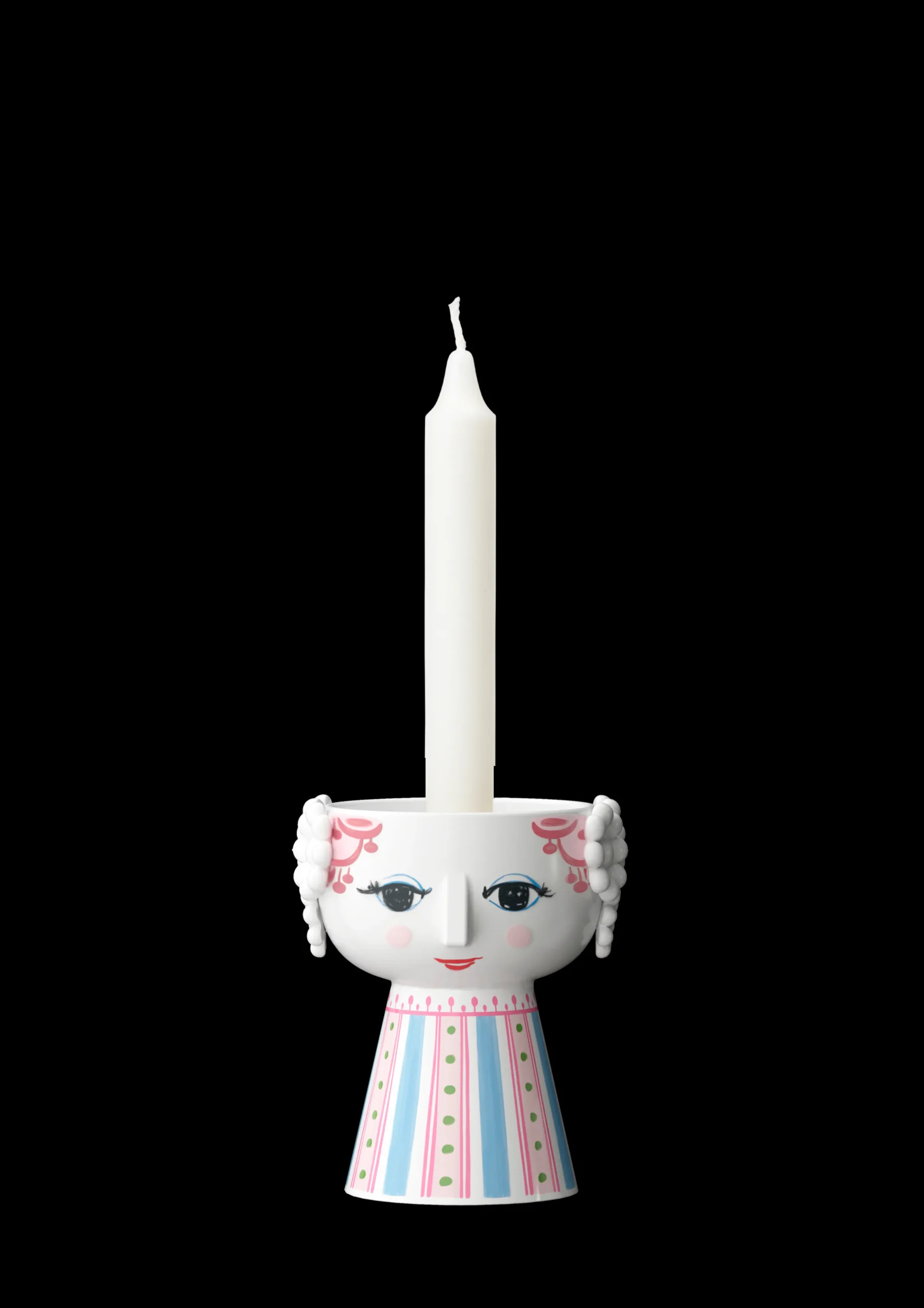 Utfold din fargerike personlighet og la kreativiteten skinne med Bjørn Wiinblads Eva. Med sitt glade smil, blussende kinn og fargerike dekorasjoner rommer Eva på alle måter essensen av Bjørn Wiinblad som person og kunstner – også når hun tar form som lysestake. Glad og drømmende skaper hun liv og personlighet i innredningen med sitt poetiske uttrykk og sine sprudlende farger. Denne Eva-lysestaken er 9,5 cm høy og er primært rosa i kombinasjon med detaljer i lyseblått og grønt, noe som skaper et friskt og levende uttrykk. Og når et tent lys plasseres i lysestaken, lyser den enda mer opp og gjør hverdagen litt mer fargerik. Lysestaken er laget av blankglasert keramikk med farget dekal og er inspirert av Bjørn Wiinblads originale Eva-univers, der brede hoder med blomsterdekorasjoner og en kjegleformet kropp dannet fundamentet. Ansiktet med de mandelformede øynene og den spisse nesen er Wiinblads opprinnelige strek, og det fargerike kjolemønsteret er en nytolkning av Bjørn Wiinblads illustrasjoner fra arkivene.