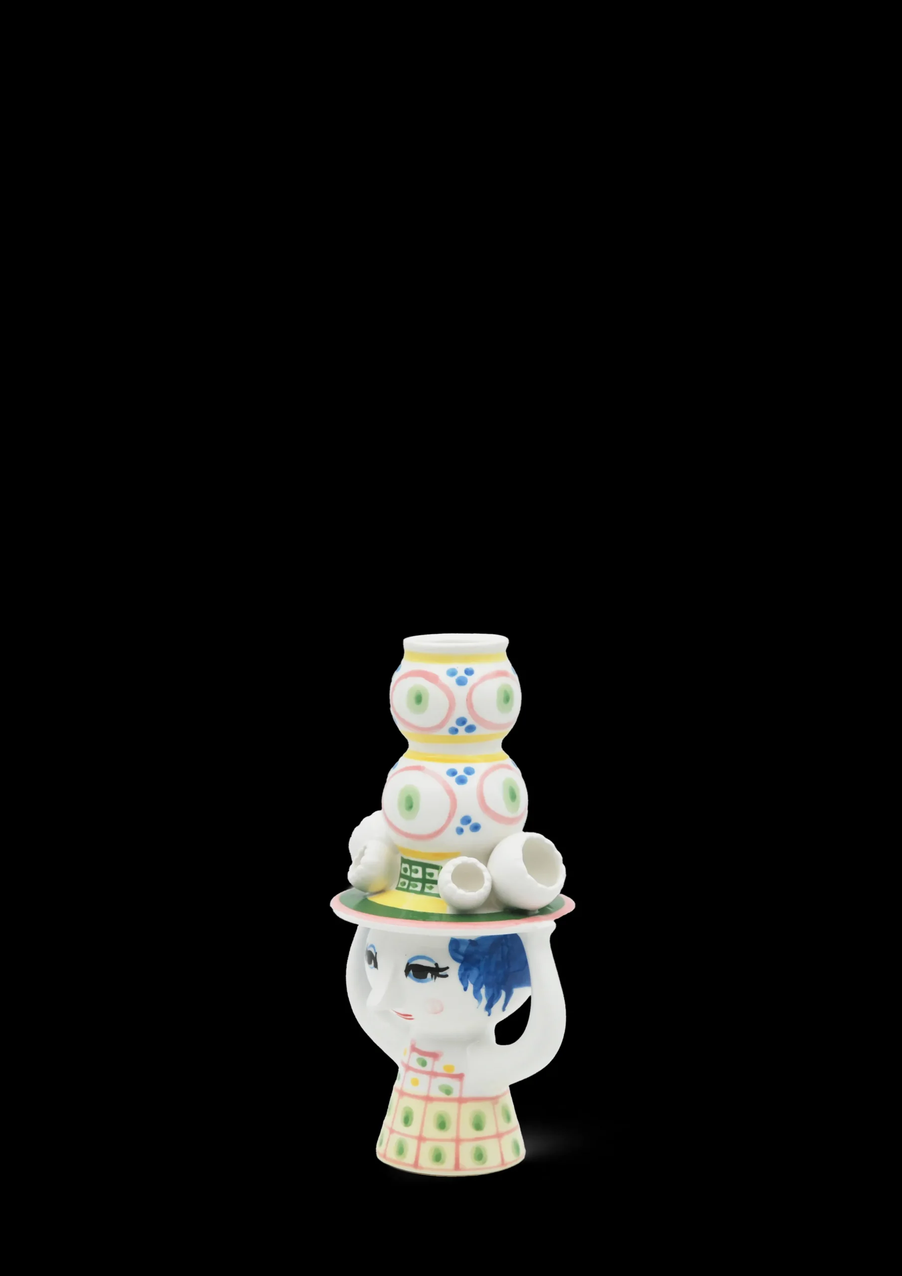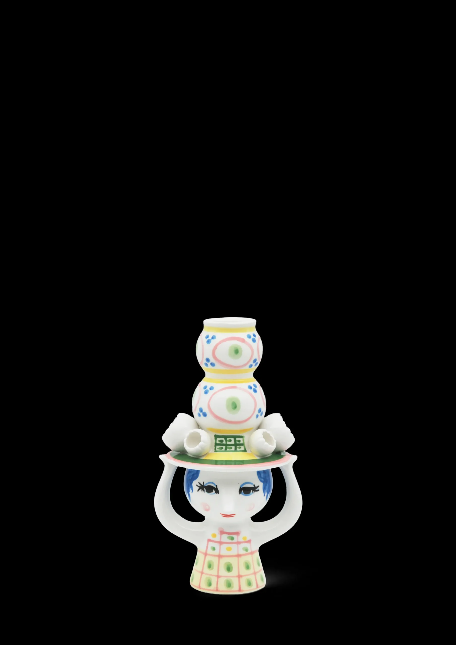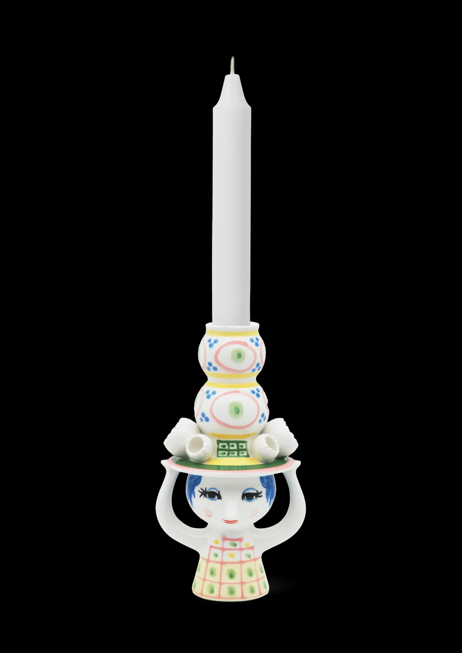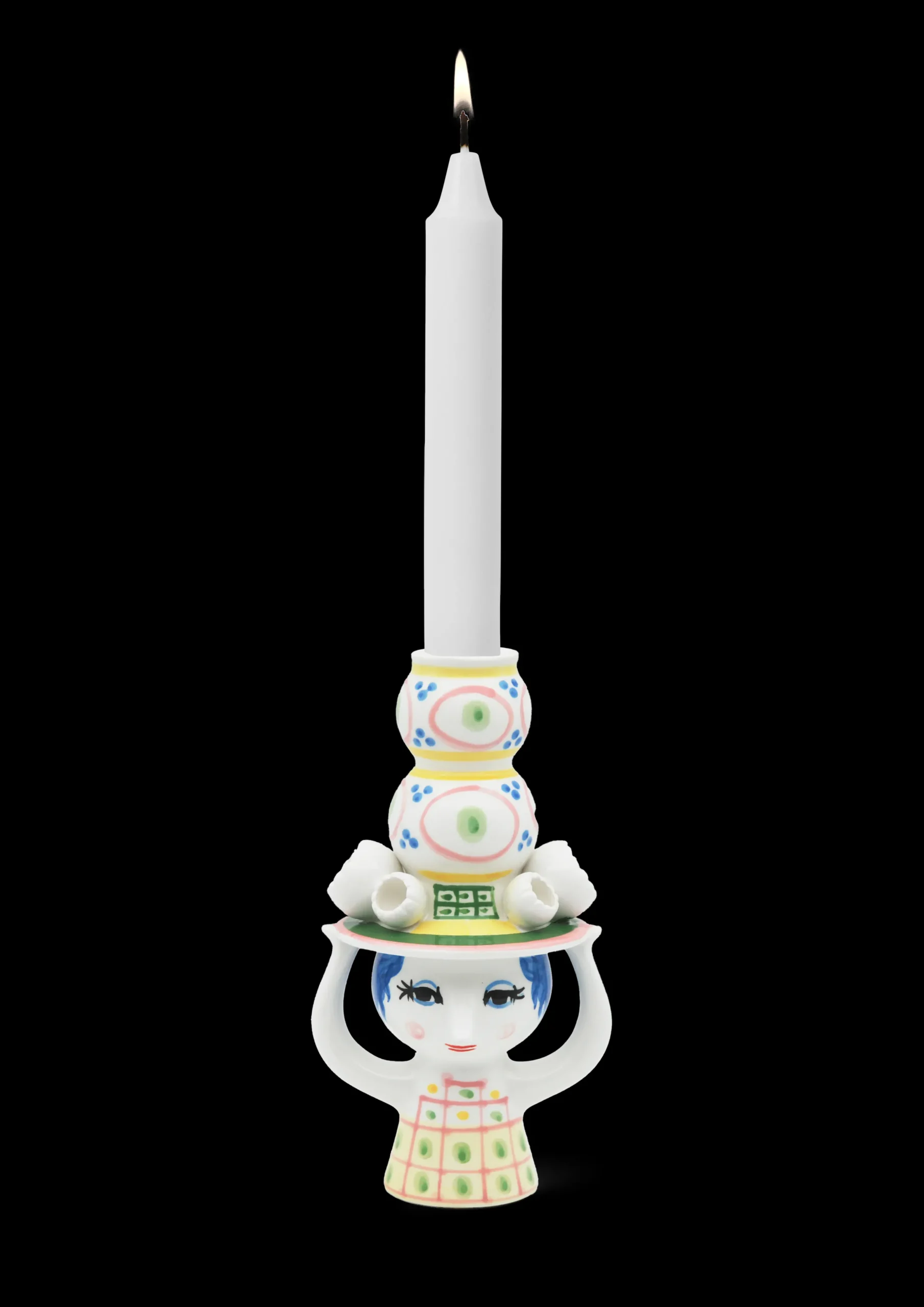 Inviter den nye hattedamen inn og la henne skape glede i boligen med sine fine farger, finurlige detaljer og håndmalte dekorasjoner. Bjørn Wiinblad hadde en forkjærlighet for figurer med hatt, og arkivene rommer utallige eksempler på hvordan hatten dukker opp igjen på stadig nye, kreative og lekne måter. Han designet selvfølgelig ikke små, fine pyntehatter. Nei, det var store, voluminøse kreasjoner som var både skulpturelle og nyskapende i uttrykket – akkurat som i serien Lady with hat. Lysestaken i blankglasert keramikk med en høyde på 16 cm er hovedsakelig rosa i uttrykket og har detaljer i grønn, gul og blå. Som et lite tårn vokser hatten opp mot himmelen, mens den fine damen balanserer hatten med hendene sine. Det gir lysestaken et finurlig og fantasifullt uttrykk som passer perfekt i en leken boliginnredning. Bruk den til både hvite, fargede, rette og vridde lys – eller hvorfor ikke med en enkel, dekorativ tørked blomst? Designen inviterer deg til å være kreativ i innredningen. En annen detalj som går igjen i serien, er de små, figurative blomstene som er plassert langs skyggen på hattene. Enda en dekorativ detalj inspirert av Bjørn Wiinblads originale former og farger. Akkurat som Bjørn Wiinblad representerer Lady with hat alt som er tullete, skjevt, kreativt og vidunderlig. Lysestaken er ikke beregnet for vann, men kan brukes til tørkede blomster.