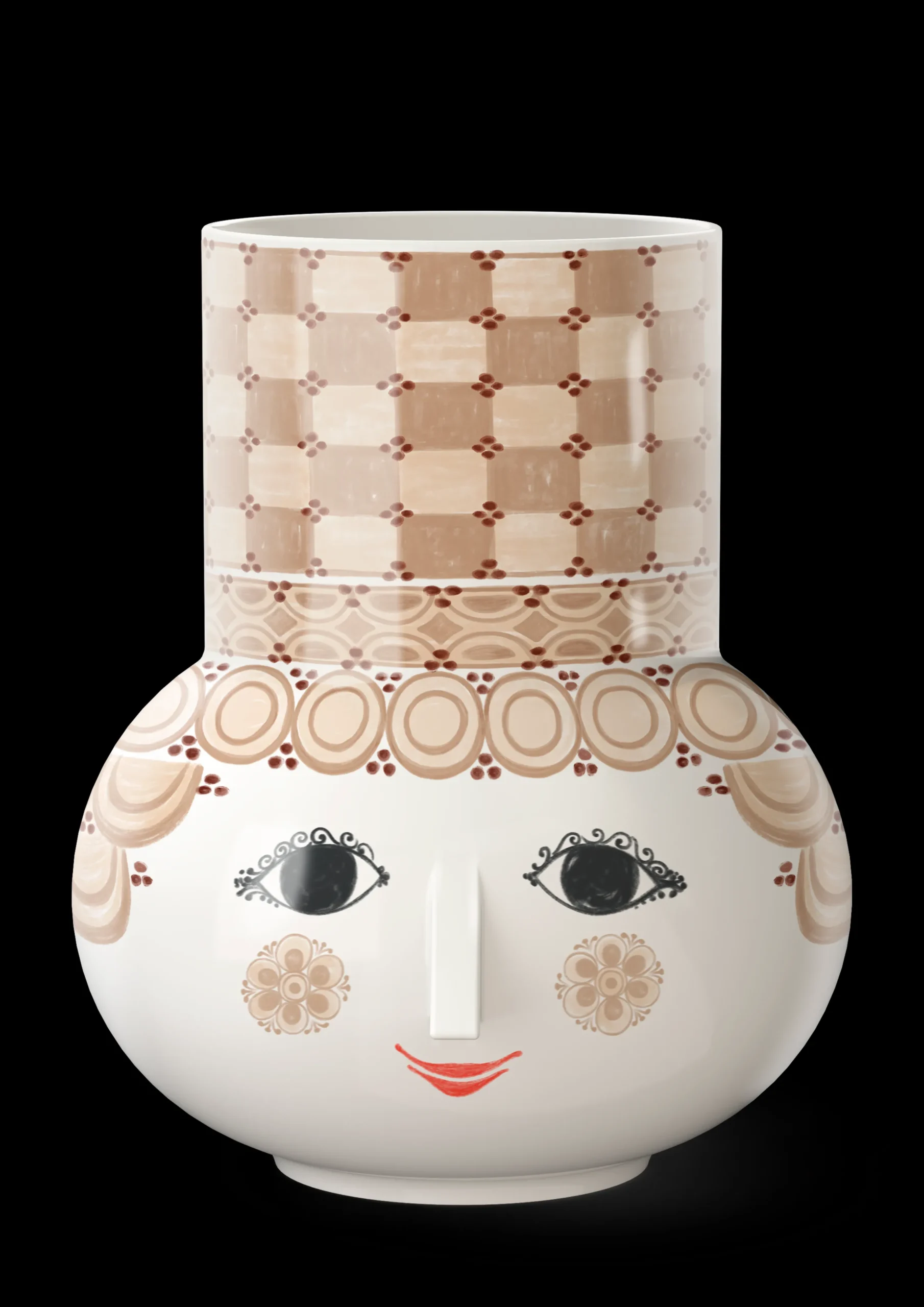 Utfold din fargerike personlighet og la kreativiteten blomstre med Bjørn Wiinblads Olga. Med sitt lyse smil, rødmende kinn og fargerike dekorasjoner, legemliggjør Olga essensen av Bjørn Wiinblad som person og kunstner – selv når hun er formet som en vase. Glad og drømmende bringer hun liv og personlighet til interiøret med sitt poetiske uttrykk og sine livlige farger. Olga-vasen er en nytolkning av en ikonisk vase som Bjørn Wiinblad skapte i samarbeid med keramikkfabrikken Nymølle. De nye Olga-vasene har den samme sylindriske toppen som vasen fra Bjørn Wiinblads imponerende designarkiv og er prydet med et søtt rundt ansikt med mandelformede øyne og den ikoniske trekantede nesen, som nesten er personifiseringen av Bjørn Wiinblads kunst. Den største vasen i serien måler hele 35 cm i høyden og smiler i all sin praktfulle skjønnhet, vakkert dekorert i en dempet sandfarge med støvete røde prikker. Alle Olga-vasene er laget av blank glasert keramikk med fargerike dekaler, og dekorasjonene er en herlig blanding av originale Bjørn Wiinblad-mønstre, som i en variert fargepalett gir deg et moderne og friskt uttrykk. Bjørn Wiinblad var en glad kunstner med en stor og fargerik personlighet, som fulgte sin egen vei og ikke var redd for å drømme og tenke stort. Hans ånd føles fullt ut i Olga, som på en veldig selvsikker måte inviterer oss til å uttrykke vår egen stil og personlighet i interiøret med fargerike blomsterbuketter, eksotiske planter og kreative dekorasjoner. En ting er sikkert: Livet blir aldri kjedelig når Olga flytter inn.
