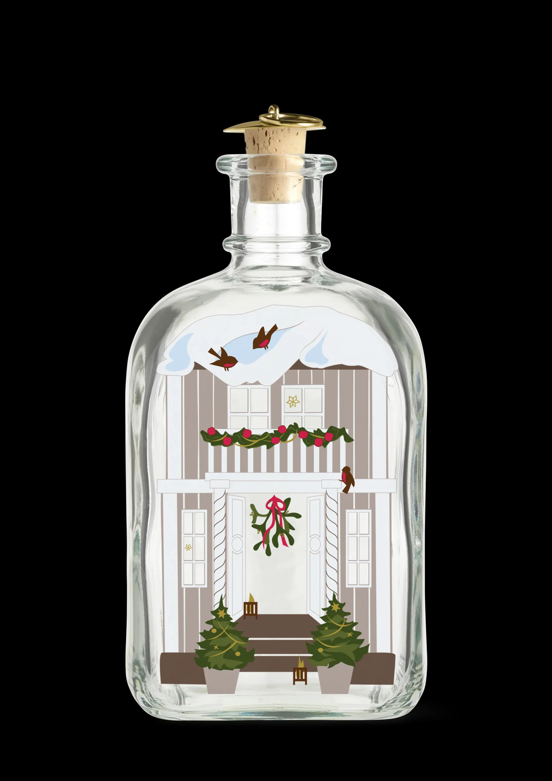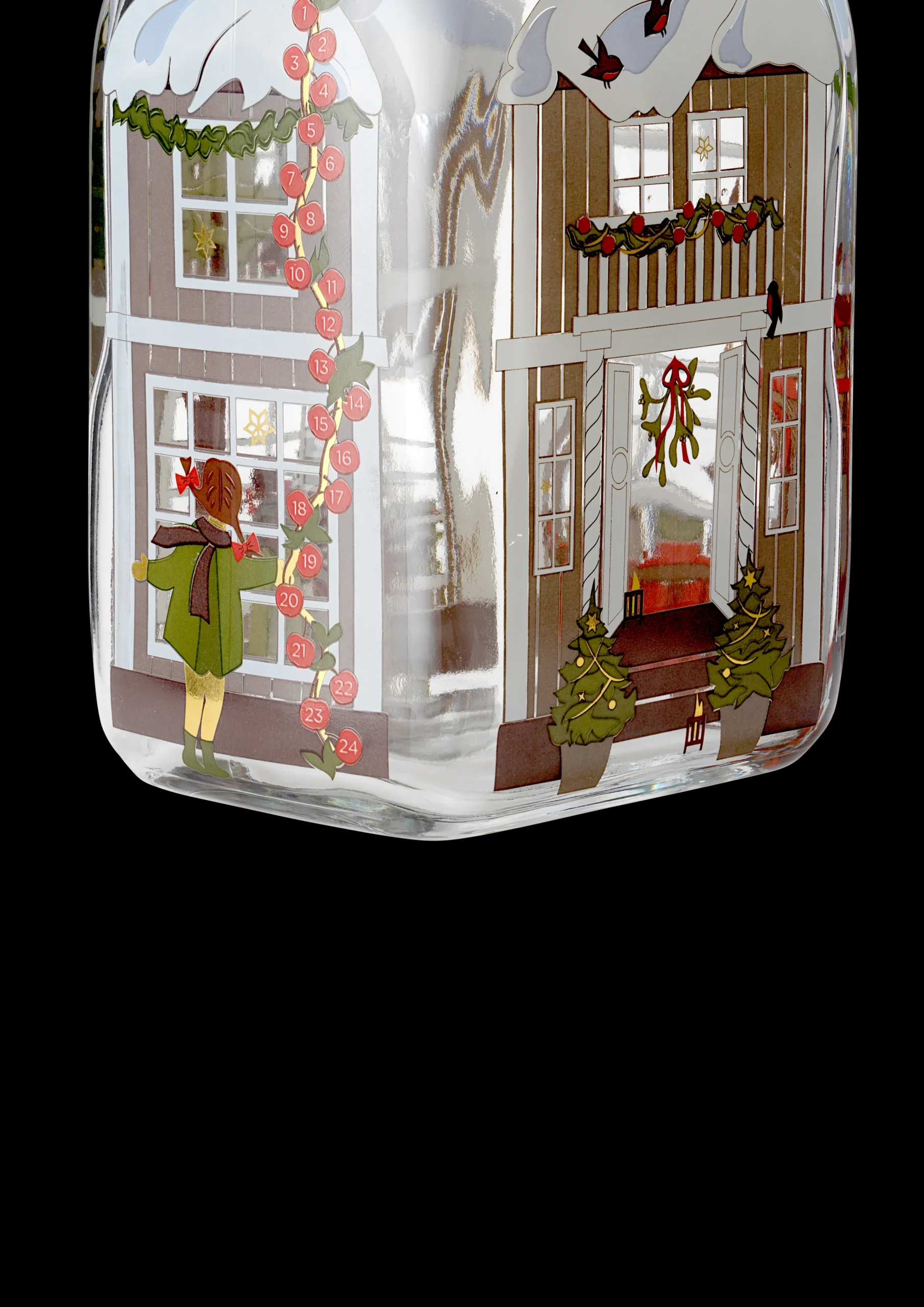 I 1981 skapte Jette Frölich for første gang sitt karakteristiske papirklipp til Holmegaards Juleflaske. Og her, fire tiår senere, er Holmegaards julekolleksjon blitt et høyt elsket samlerobjekt for mange julefans. I år har refleksjonene hennes over julens magi munnet ut i en vakkert illustrert julekolleksjon for Holmegaard, hvor Jette Frölich inviterer oss til å feire julen sammen. Frölichs 2022-fortolkning av den stemningsfulle høytiden illustrerer på vakreste vis budskapet om vår felles jul. I julen er det hjemmet som er midtpunktet, og illustrasjonene på flasken gjenspeiler forventningens glede når vi kryper sammen innendørs og samles med familie og venner fra nær og fjern. På forsiden ser du en hoveddør flankert av juletrær, lanterner på trappen, julelys, snø og stakitt. På sidene kan du se gjennom vinduene at det er pyntet med julepynt, juletre og gaver. Og for å understreke forventningens glede står det små barn ved vinduet og kikker inn. Du finner også et preg av tradisjon og forventningens glede for de voksne. Ned langs siden finner du den klassiske kalenderen, så du dag etter dag frem mot jul kan se frem til å nyte litt av flaskens innhold og langsomt, men sikkert nærme deg den 24. desember.
