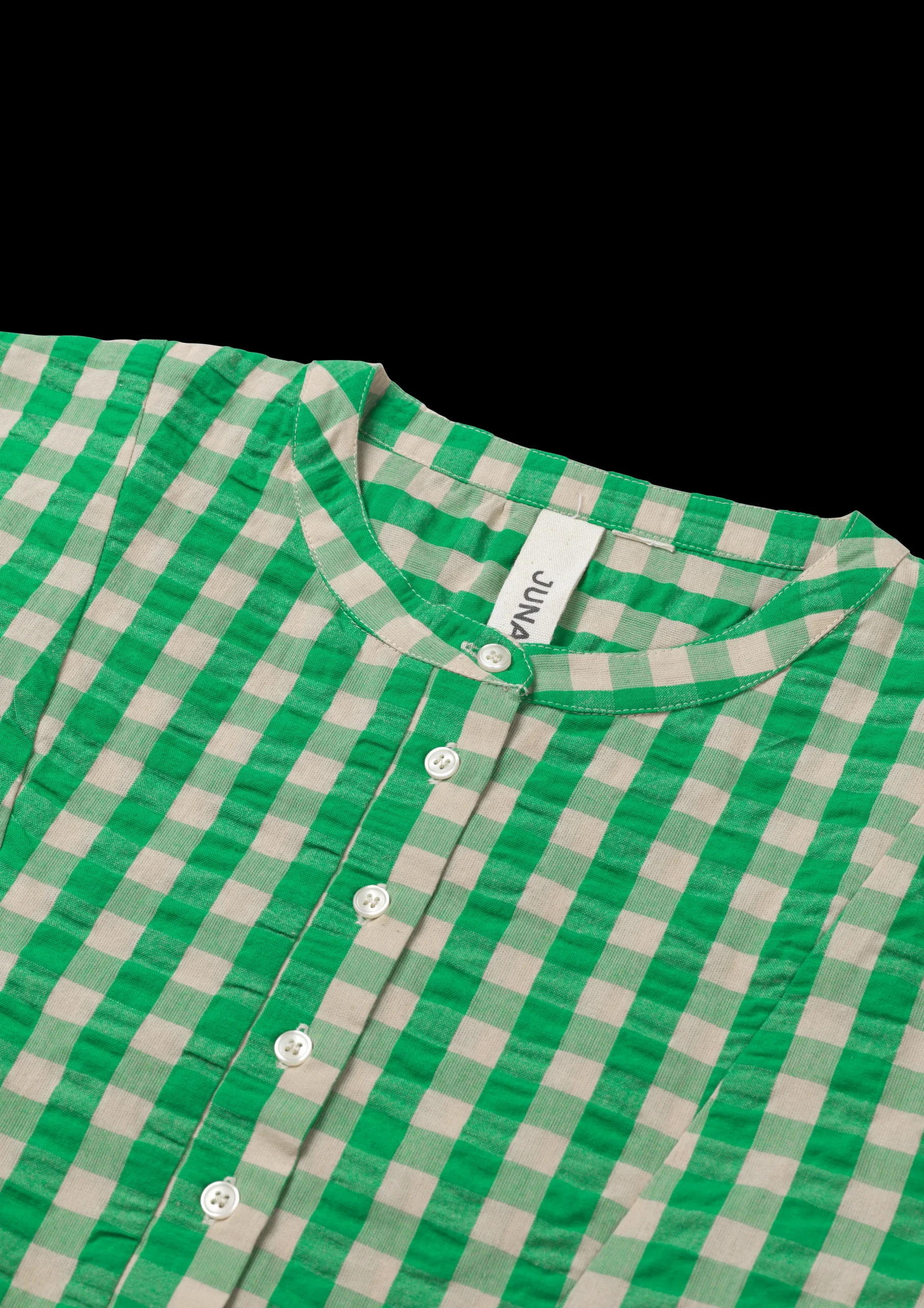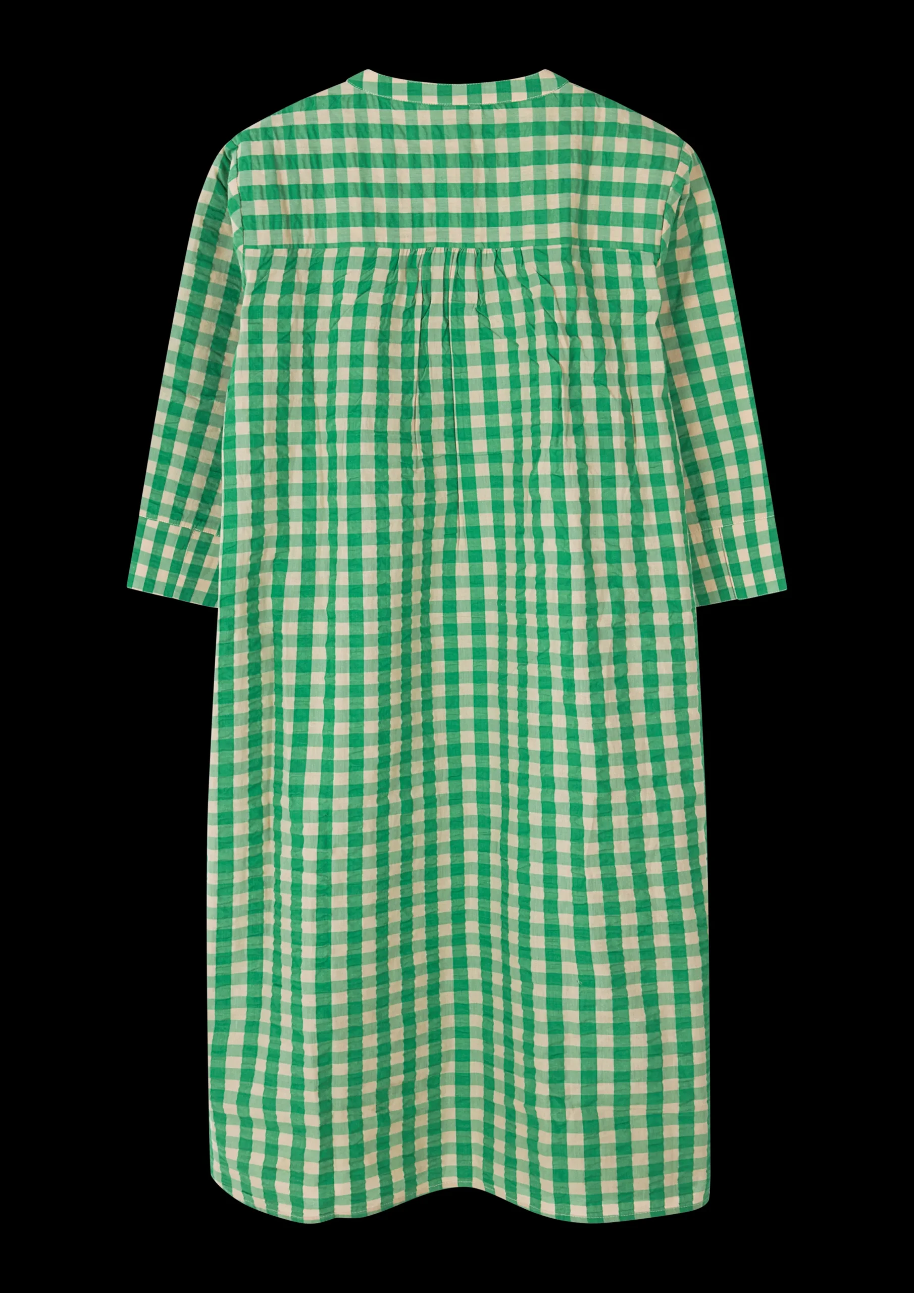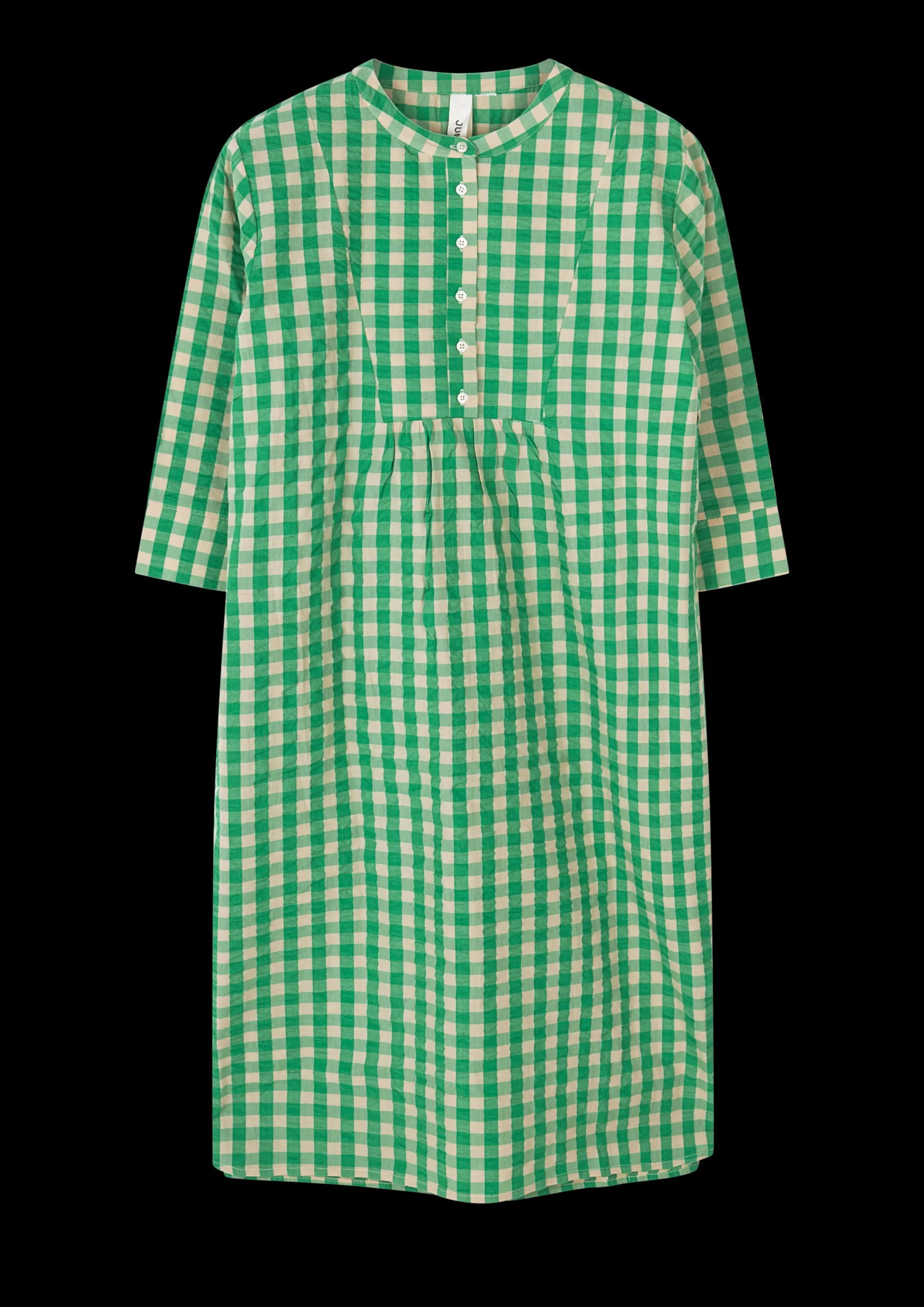 Juna Garderobe er fylt med lett og luftig sommertøy, som både kan brukes som nattøy på varme sommernetter, og som en del av en uformell sommergarderobe – perfekt til lange sommerdager i hagen og spennende utflukter. Sonja-kjolen i grønn/sand rutete Bæk u0026 Bølge har en løs passform og et behagelig snitt, som gjør den til en perfekt sommerkjole. Kjolen har fine rysjedetaljer ved knappene og feminine folder, som gir et lett og elegant uttrykk. Kjolen går cirka til knærne, har innvendige lommer i sidene og ¾-lange ermer. Perfekt til både sommerfesten, strandturen og å slappe av i hengekøyen. Sonja-kjolen i grønn/sand Bæk u0026 Bølge er fremstilt i 100 % økologisk bomull, som både er OEKO-TEX®-merket og GOTS-sertifisert, produseres i overensstemmelse med EU-standarder og tåler maskinvask opptil 40 °C. Dette er ikke bare skånsomt for miljøet, men også for tøyet, som varer lenger når du vasker på lavere temperatur. Merk at dette produktet har en stor passform.