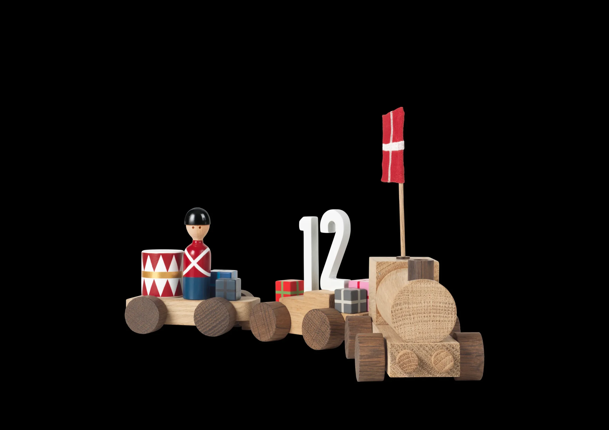 Dette flotte bursdagstoget er inspirert av et originalt Kay Bojesen-tog og er laget for å brukes som et dekorativt element til bursdager. Det fungerer også perfekt som en dekorasjon på hyllen, slik at du daglig kan nyte Kay Bojesens originale fortellinger laget av tre. De tre vognene er dekorert med flagg, fargerike gaver, tall, den lille gardisten og en tromme – alle festlige elementer fra Kay Bojesens kreasjoner. Kay Bojesen bursdagstog kommer med tall fra 0 til 9 (med to ett-tall), som i likhet med flagget kan settes inn i hullene i vognene så du kan skape din egen kombinasjon. Bursdagstoget er ikke en leke, men er ment å brukes som dekorasjon.